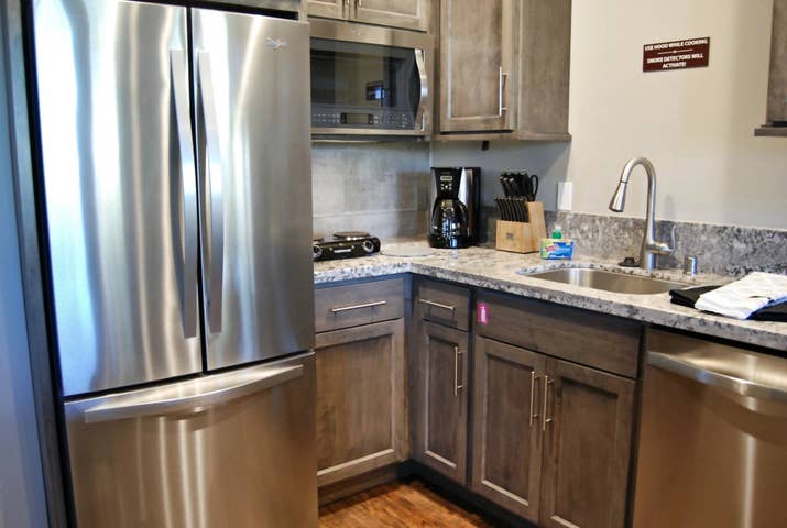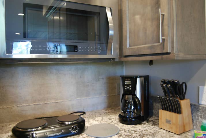 Kitchen – Large Fridge, 2 burner countertop stove, Microwave and Convection Oven (can roast/bake), Dishwasher, Blender, Toaster, Coffee Maker, Tea Kettle, Countertop Oven, French Press, Dishware, Cookware, Utensils, Bakeware