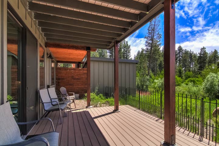 Sweeping Mountain views await you outside. Take a peaceful morning stroll or jog along the nearby Trout Creek. Enjoy the community patio furniture for an outdoor meal. Admire the beautiful scenery of the property. Or walk to the beach in a minute!