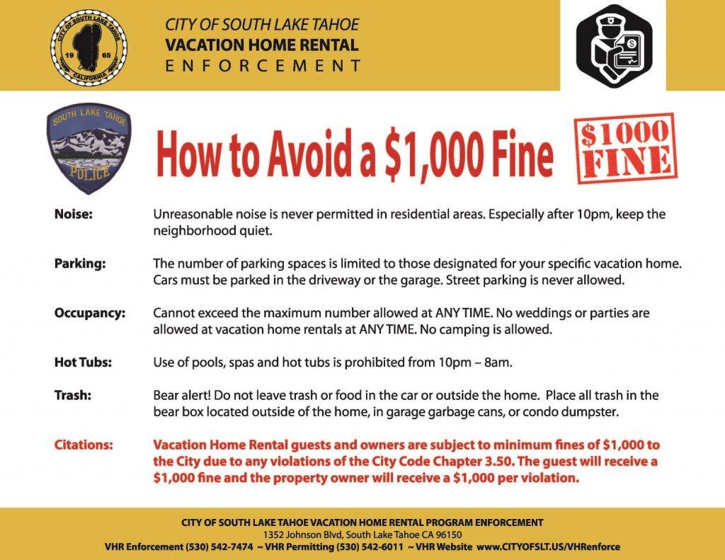 Violations subject to $2,000 (split) fine are: street parking, excessive noise anytime but especially after 10 p.m., trash outside bear box, exceeding posted occupancy and vehicle limits, hot-tub use between 10 p.m. and 8 a.m.