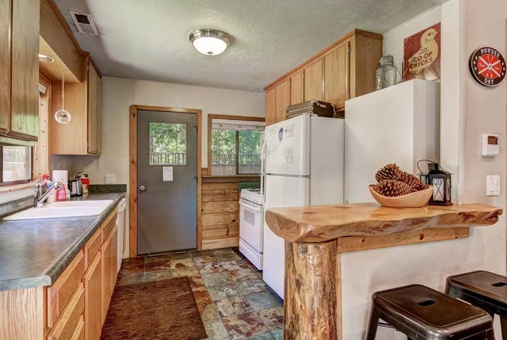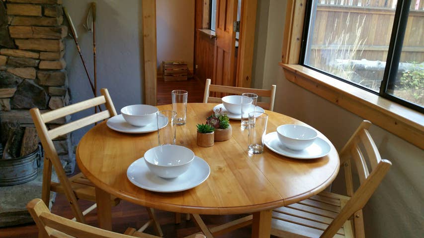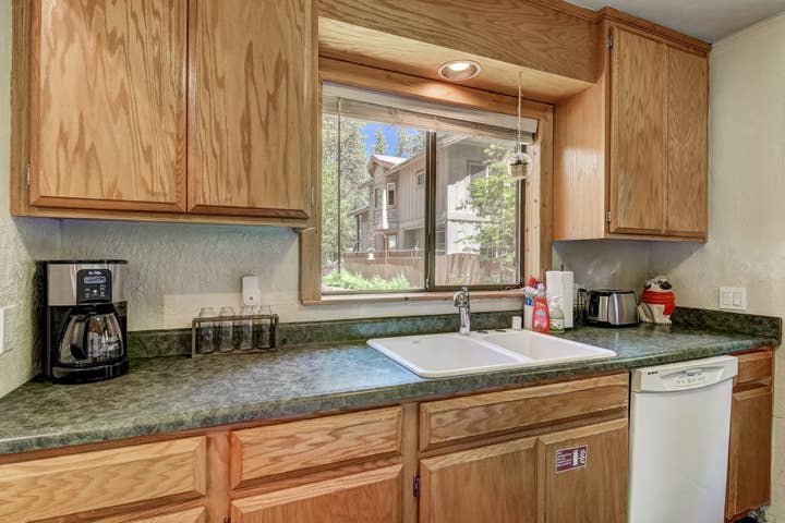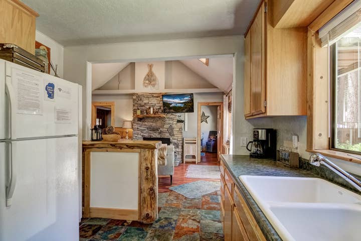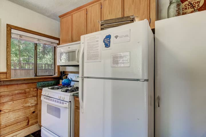 The Tahoe Vacation home has completely stocked kitchen with small island for two and a foldable dining table and chairs that seats four. The living room has wood burning fireplace, and large TV with DVD player and Netflix.