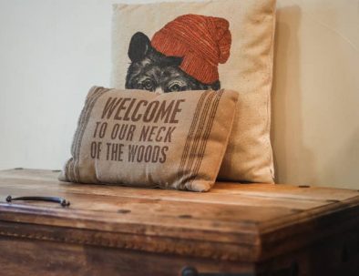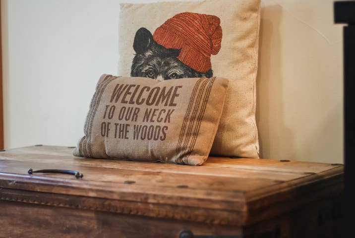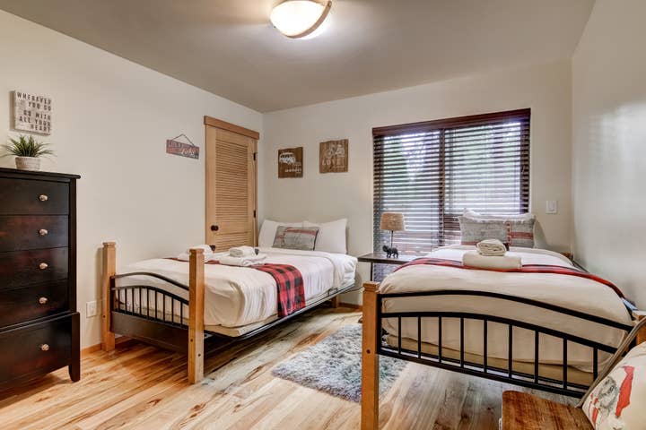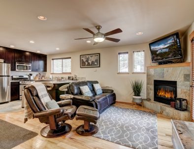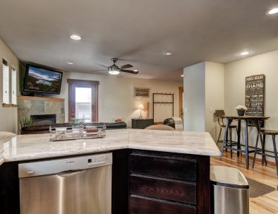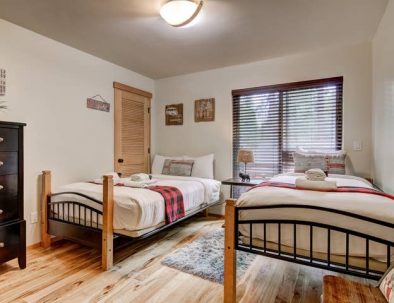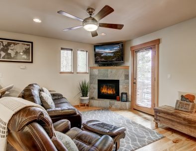 In the great room, comfy furniture and a stone fireplace add to the lodge ambiance. There’s a flatscreen cable TV in the living room, plus WiFi to check the weather. A fully equipped kitchen has everything you’ll need to prepare delicious dinners, as well as a dishwasher to make cleanup afterward quick.