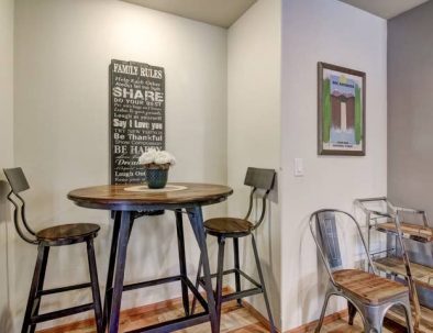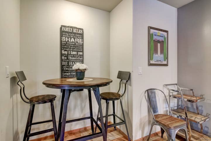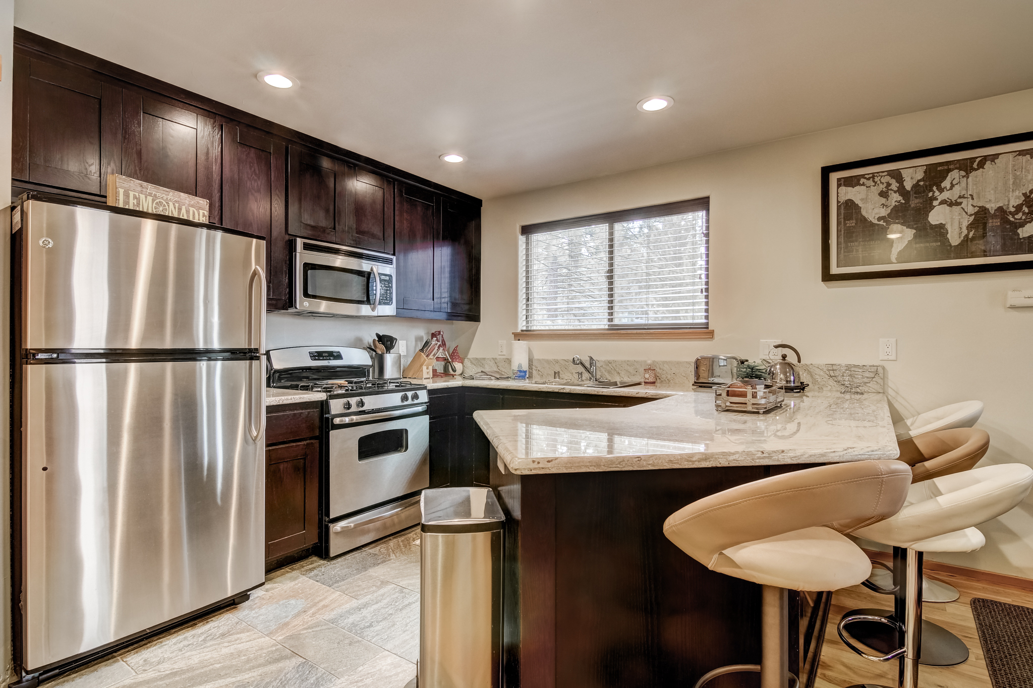 The home has completely stocked kitchen with granite island that seats three and a bistro dining table and chairs that seats two. The living room has gas burning fireplace, and large TV with cable.