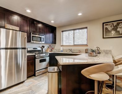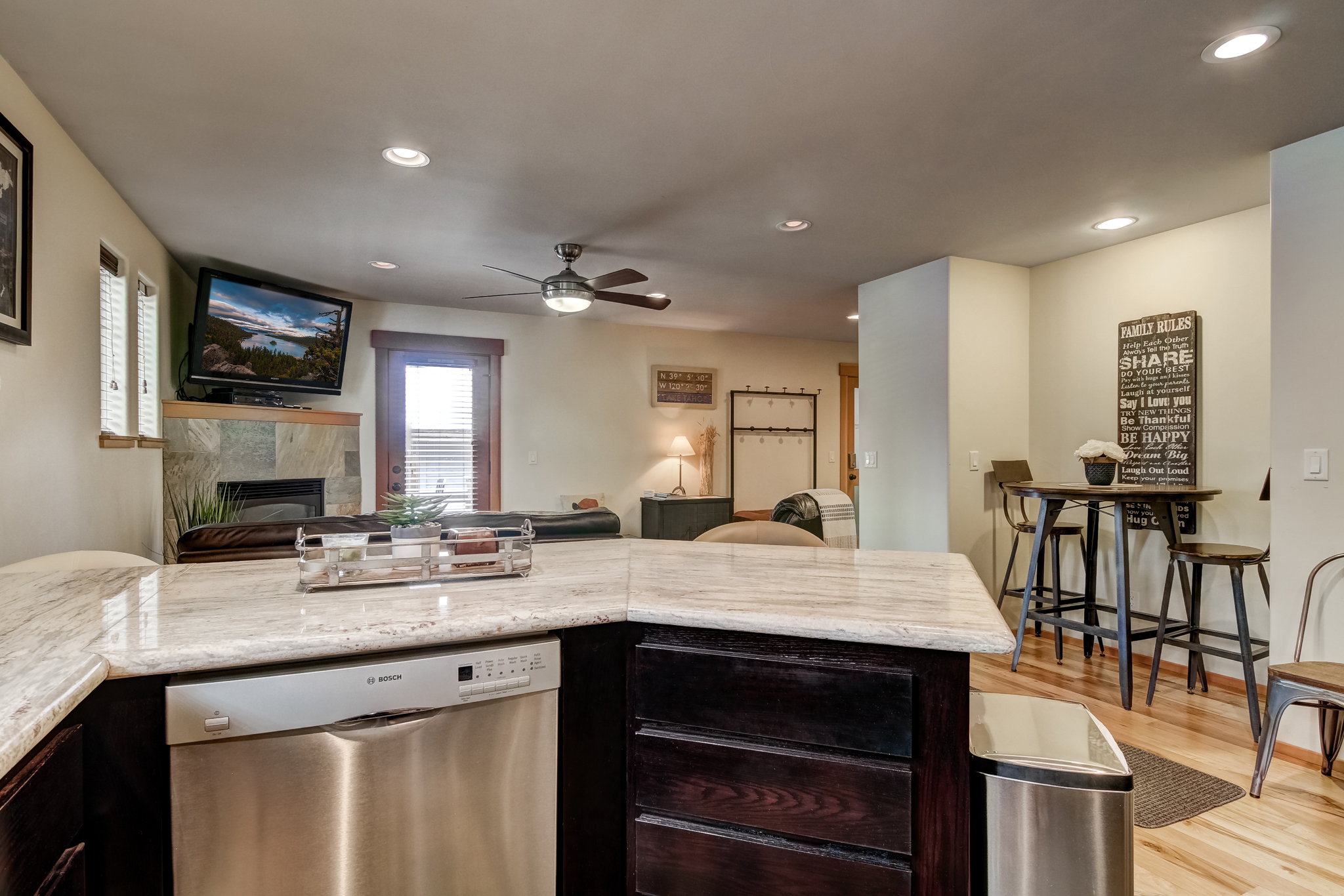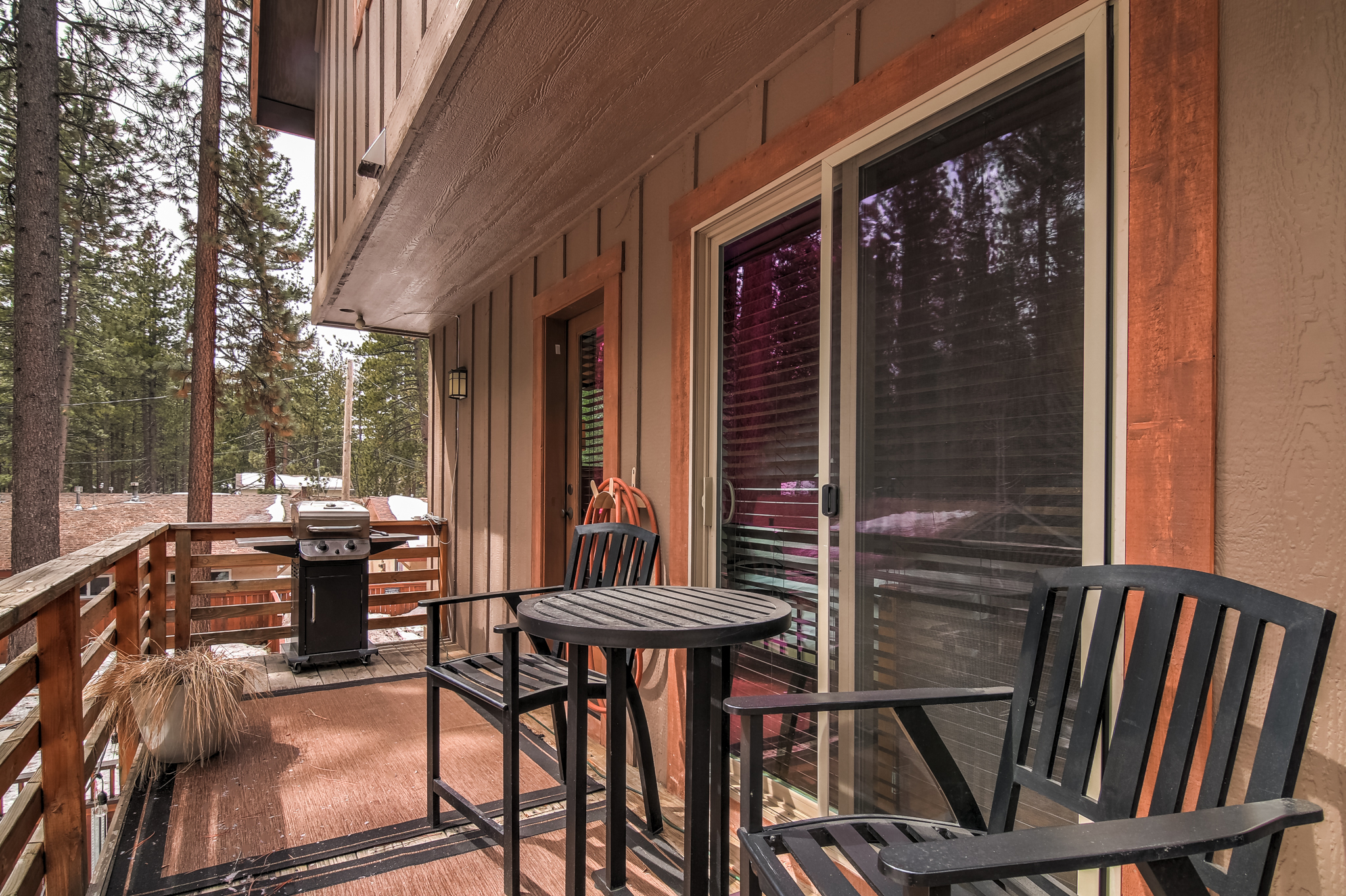 The open floor plan, modern finishes, fireplace and flat screen TV make the living area a great place to relax after an adventurous day of exploring the Heavenly Valley. The kitchen is well equipped with everything needed to prepare a meal and the dining table seats 4. In warmer months enjoy a glass of wine or a meal on the deck.