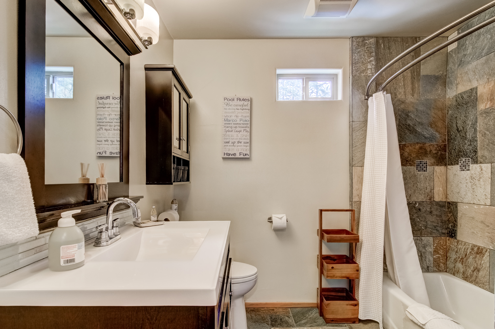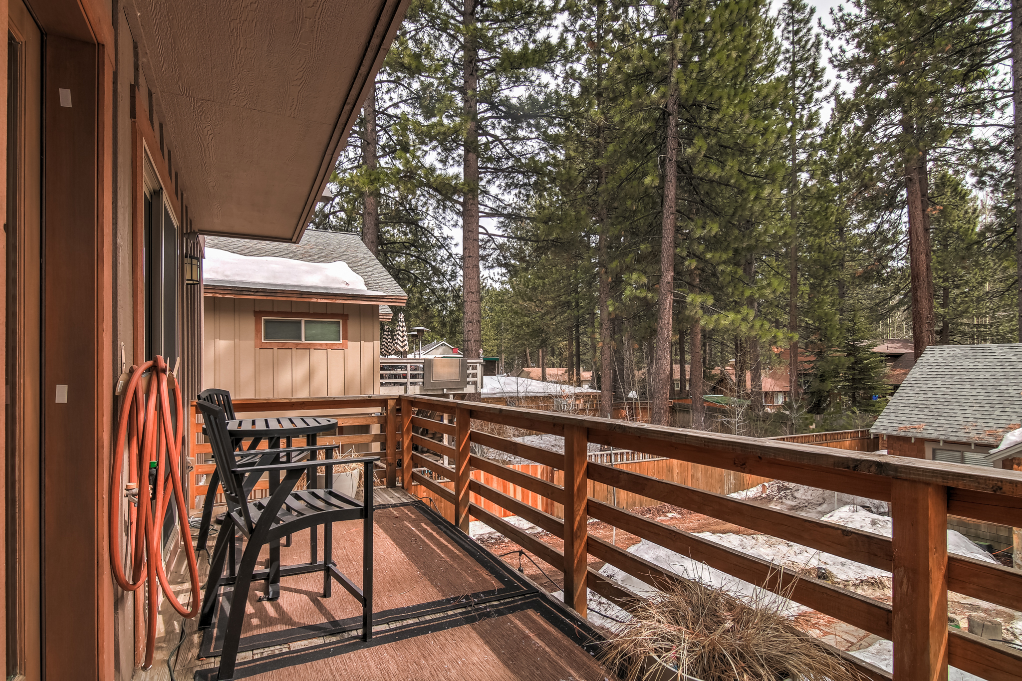 In order to comply with the City of South Lake Tahoe’s Vacation Rental Ordinance for occupancy and parking the exterior of this home is monitored by a video camera. The Property has one exterior camera facing the front yard/driveway area and one facing the backyard area. This video footage is not shared and is recorded for liability reasons only, In the cases of a break-in, death, injury, guests sneaking in pets, guests disregarding the maximum occupancy allowed and in no way infringes upon the guests’ expectations of privacy in these public areas of the property.